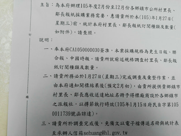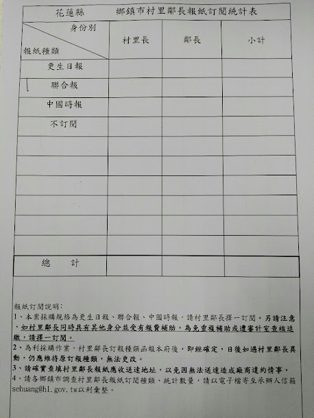 花蓮縣府1月19日隨即發公文,要求鄰里長未來只能訂定更生日報、聯合報或中國時報。 圖:翻攝自台大批踢踢實業坊